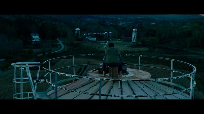 We see hints of newspapers from all across the globe, detailing what they know about the creatures, with headlines such as “It’s Sound!” and “Stay Safe. Get Underground!” but never any real information. Are there people actually underground? Why didn’t Jim and his family follow them? There is a scene (see picture above) where it’s shown that there are other families in this countryside, maybe a dozen or so. Wouldn’t it be better for them to band together and try to do something?